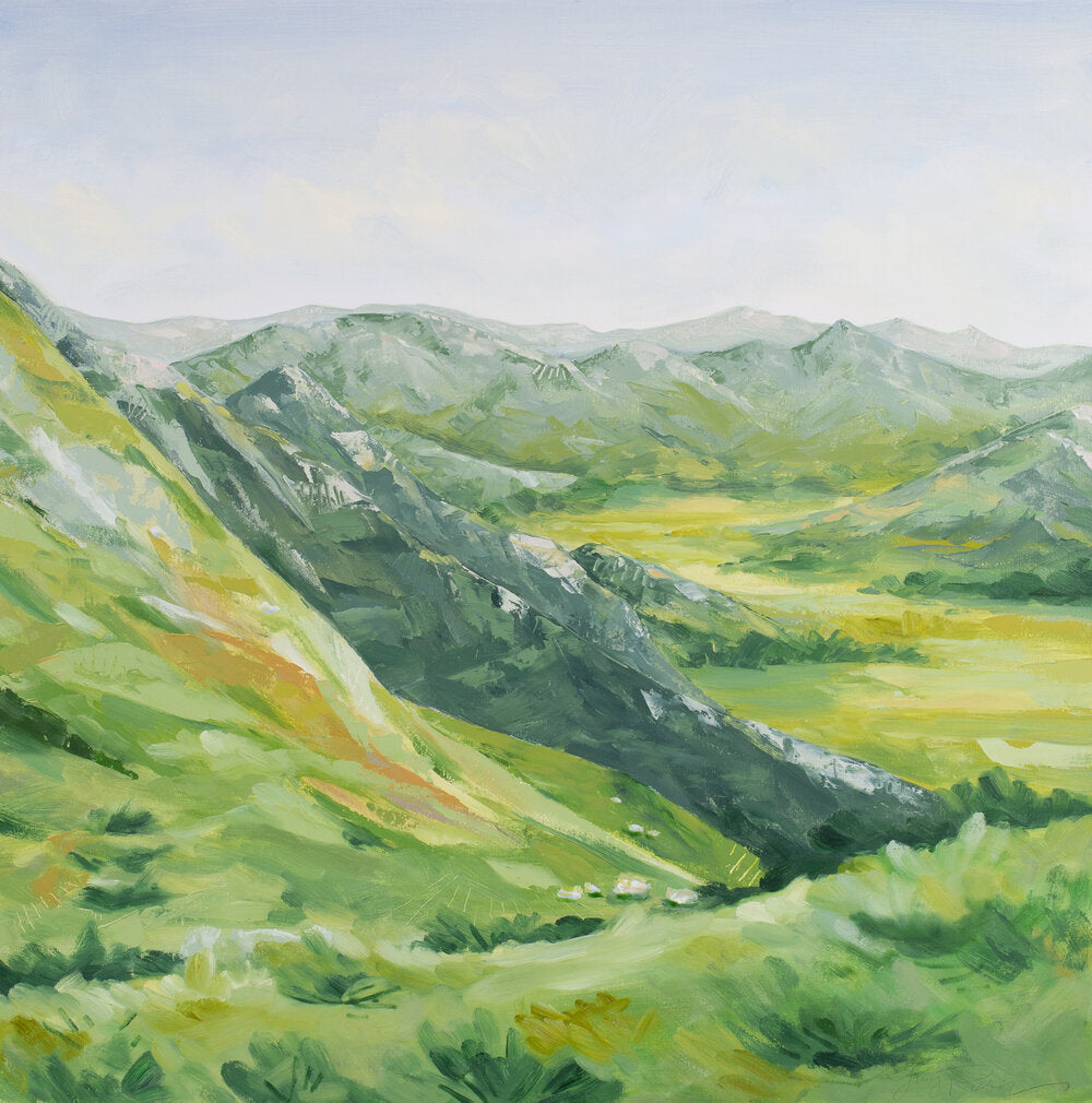The idea for the Alps series was born during my time spent hiking and hut-hopping through the Swiss and Austrian Alps. What I love about painting landscapes is capturing the feeling a certain place first evoked - freedom, gratitude, presence, WONDER. My hope for these paintings is that they serve as invitations into that sense of wonder and awe. That they would be little windows to a state of mind where you can breathe deeply and for a moment feel a bit more alive.