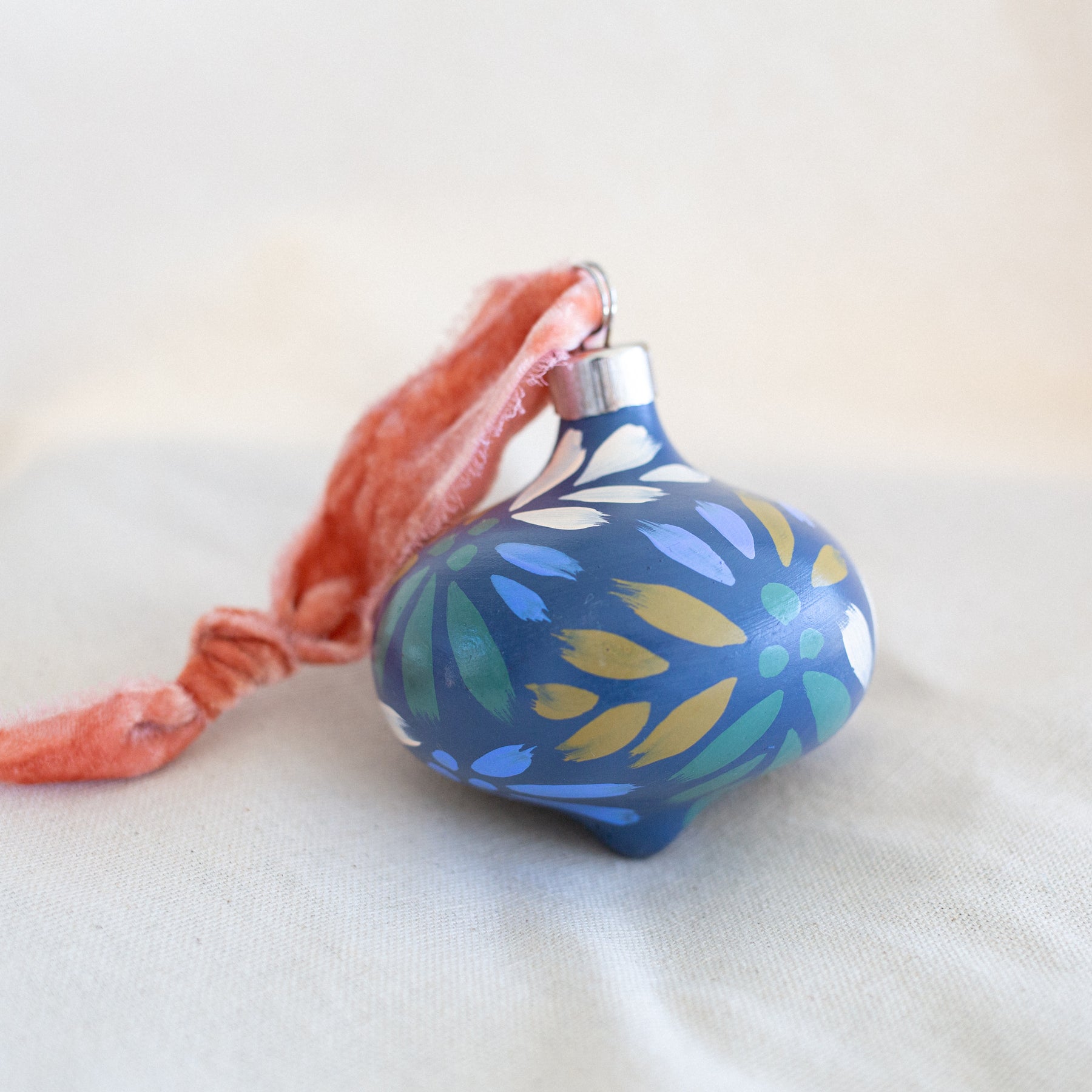 This is a one of a kind hand-painted ceramic ornament with a raw-edge silk velvet ribbon.