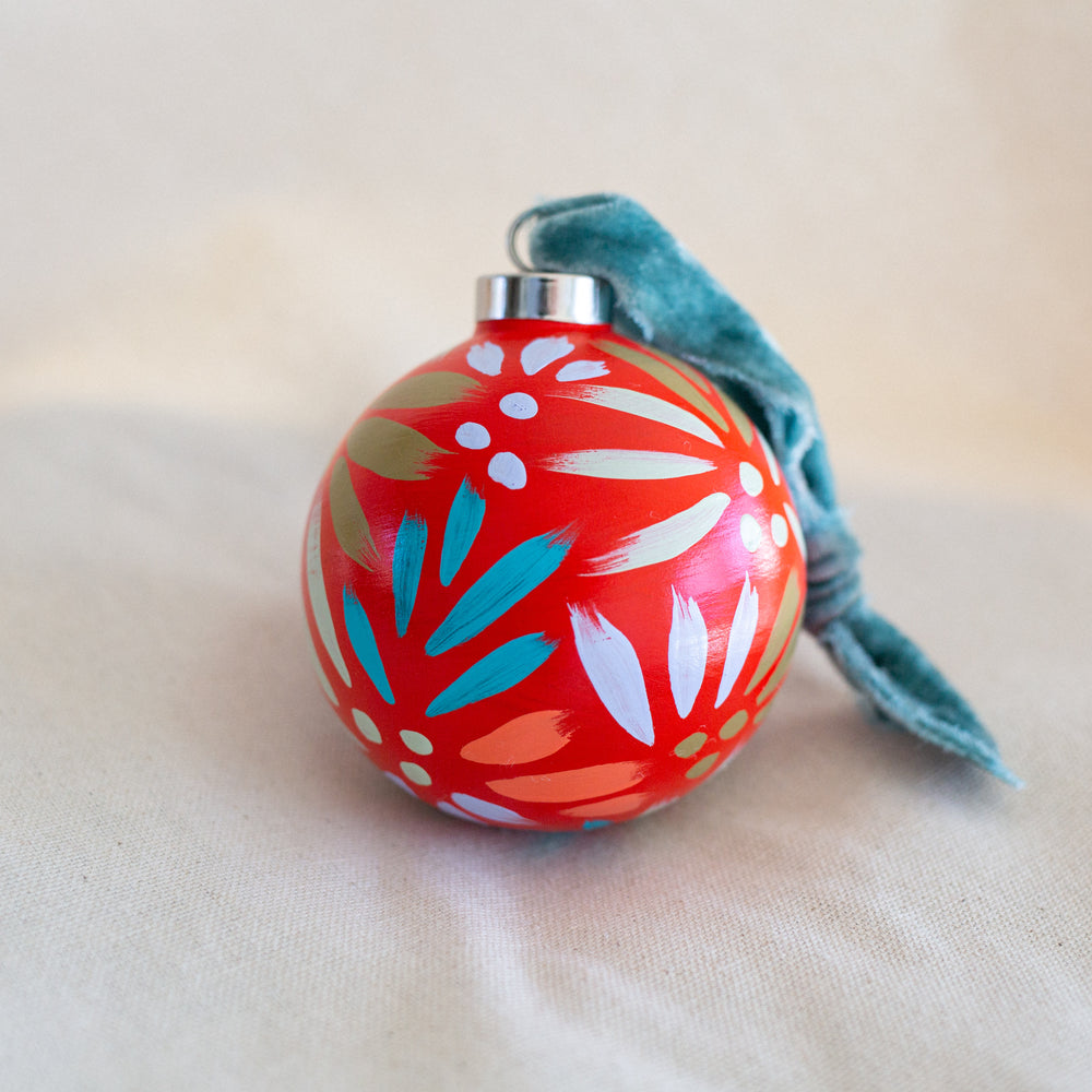 This is a one of a kind hand-painted ceramic ornament with a raw-edge silk velvet ribbon.